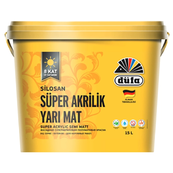 “Dış Cephe Süper Akrilik Yarı Mat” içerdiği özel reçine ve silikon sayesinde uygulanan yüzeylerde su iticiliği, yüksek su buharı geçirgenliği, neme ve tuzlu suya karşı direnç sağlar. Yüzeyde oluşan kılcal çatlakları köprülüme özelliği vardır. Güneş gören yüzeylerde renk solmasına karşı dirençli özel pigmentler kullanılmıştır. Kir tutmaz böylece uzun yıllar boyanın ilk günkü gibi kalmasını sağlar. Uygulaması kolay, yayılması çok iyidir.